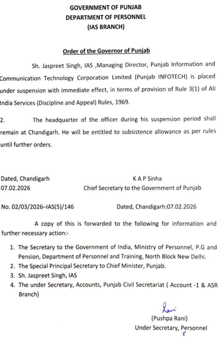 पंजाब सरकार ने शनिवार को 2 IAS अधिकारियों को सस्पेंड कर दिया। सूत्रों से पता चला है कि आंगनबाड़ी कार्यकर्ताओं के लिए स्मार्टफोन खरीदने में देरी के मामले में यह एक्शन हुआ है। यह मामला काफी पुराना है। हालांकि आर्डर में वजह साफ नहीं की गई है। इसके साथ एक अतिरिक्त मुख्य सचिव और एक संयुक्त सचिव का तबादला कर दिया। जबकि कुछ 4 अधिकारियों की टांसर्फर की गई।