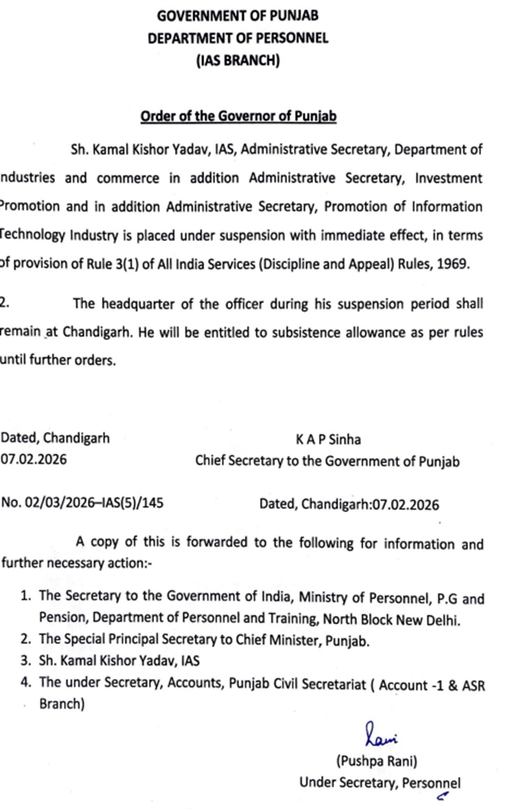 उद्योग, निवेश प्रोत्साहन और सूचना प्रौद्योगिकी प्रोत्साहन विभाग के प्रशासनिक सचिव कमल किशोर यादव और पंजाब इन्फोटेक के प्रबंध निदेशक जसप्रीत सिंह को तत्काल प्रभाव से निलंबित कर दिया गया है। निलंबित किए गए दोनों अधिकारियों को चंडीगढ़ स्थित राज्य मुख्यालय में तैनात किया जाएगा। वहीं, इस दौरान 2001 बैच के आईएएस अधिकारी गुरकीरत किरपाल सिंह को आखिरकार आज तैनाती दे दी गई है। उन्हें उद्योग, निवेश प्रोत्साहन और सामाजिक सुरक्षा विभाग का प्रमुख बनाया गया है। यह दोनों पद कमल किशोर व विकास प्रताप के पास थे। गुरकीरत पिछले करीब 11 महीनों से पोस्टिंग का इंतजार कर रहे थे। जबकि पंजाब इन्फोटेक के एमडी का अतिरिक्त प्रभार एसएस बराड़ को सौंपा गया है। इसी तरह सामाजिक सुरक्षा विभाग के विकास प्रताप और संयुक्त सचिव आनंद सागर शर्मा को भी हटा दिया गया है। विकास प्रताप को फिलहाल कोई नई पोस्टिंग नहीं दी गई है, जबकि आनंद सागर शर्मा को गुरदासपुर का अतिरिक्त डिप्टी कमिश्नर नियुक्त किया गया है। इसी तरह 1998 बैच के आईएएस अधिकारी एस करूणा राजू को प्रमुख रेसिडेंट कमिश्नर पंजाब भवन नई दिल्ली तैनात किया गया है।